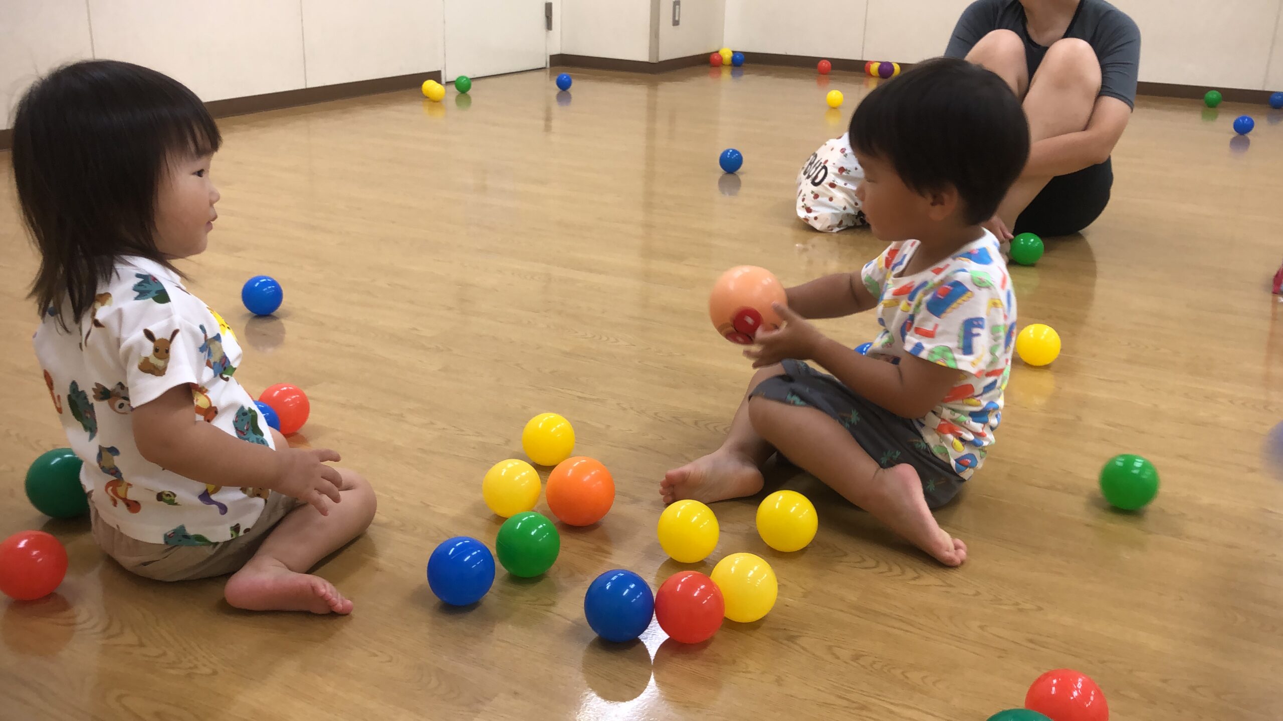 親子で行うベビーマッサージなどの体操やボール遊び、季節の制作を行います。