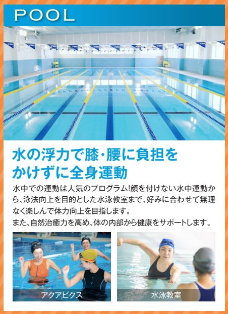 水の抵抗を利用して歩くレッスンや音楽に合わせて動くアクアビクスなど泳げないレッスンも毎日開催しております。