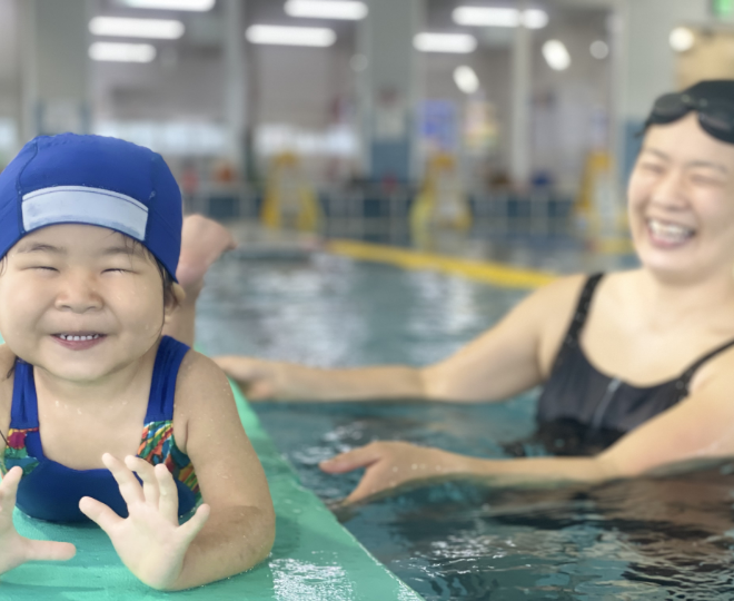 親子で一緒にプールに入り、スキンシップを図りながら無理なくプールに導きます。また、お母さんの産後の運動にも最適です。