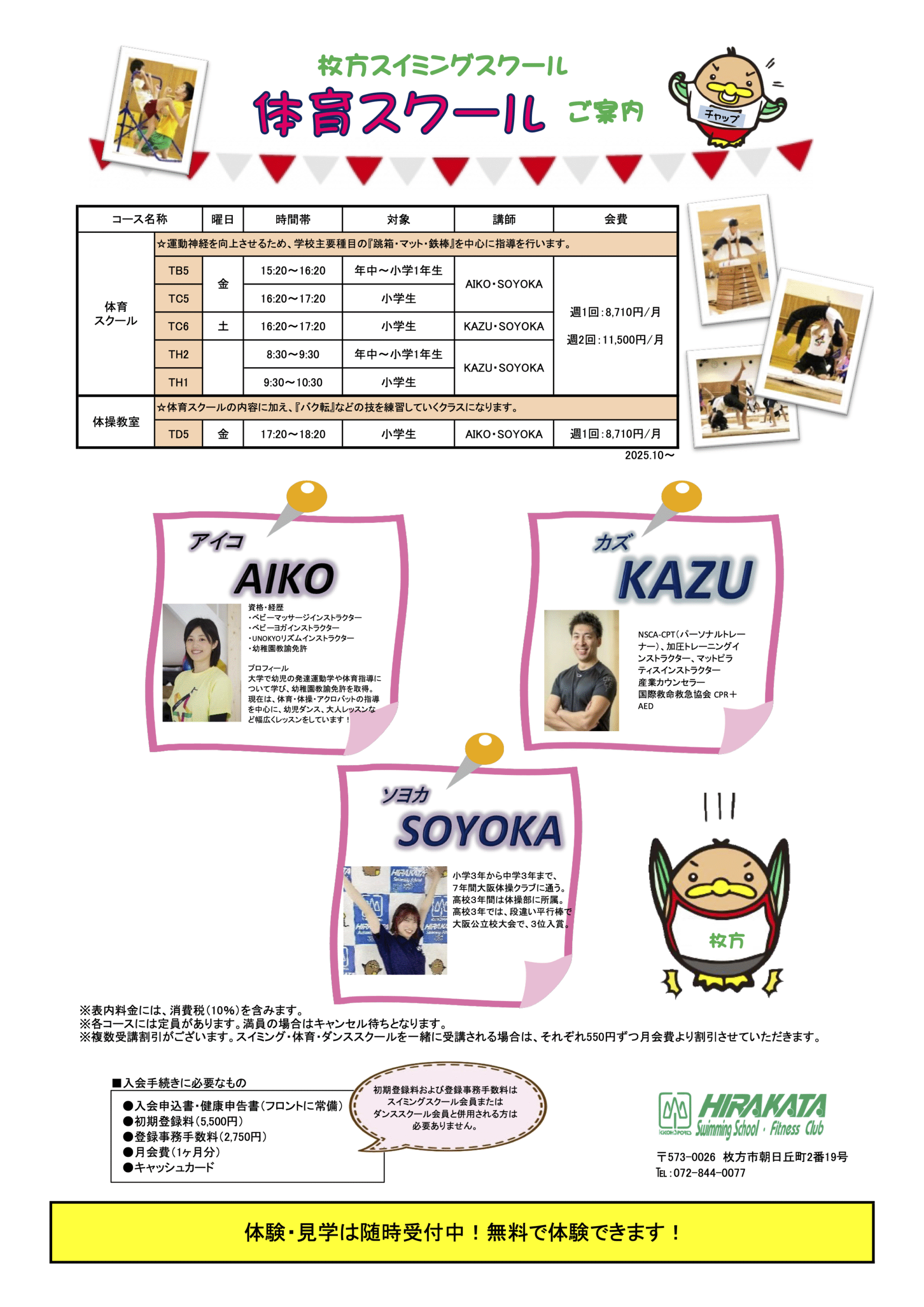 ※スイミングスクール会員の方は、複数受講割引がございます。体育スクールもしくはダンススクールを一緒に受講される場合は それぞれ550円ずつ月会費より割引させていただきます。